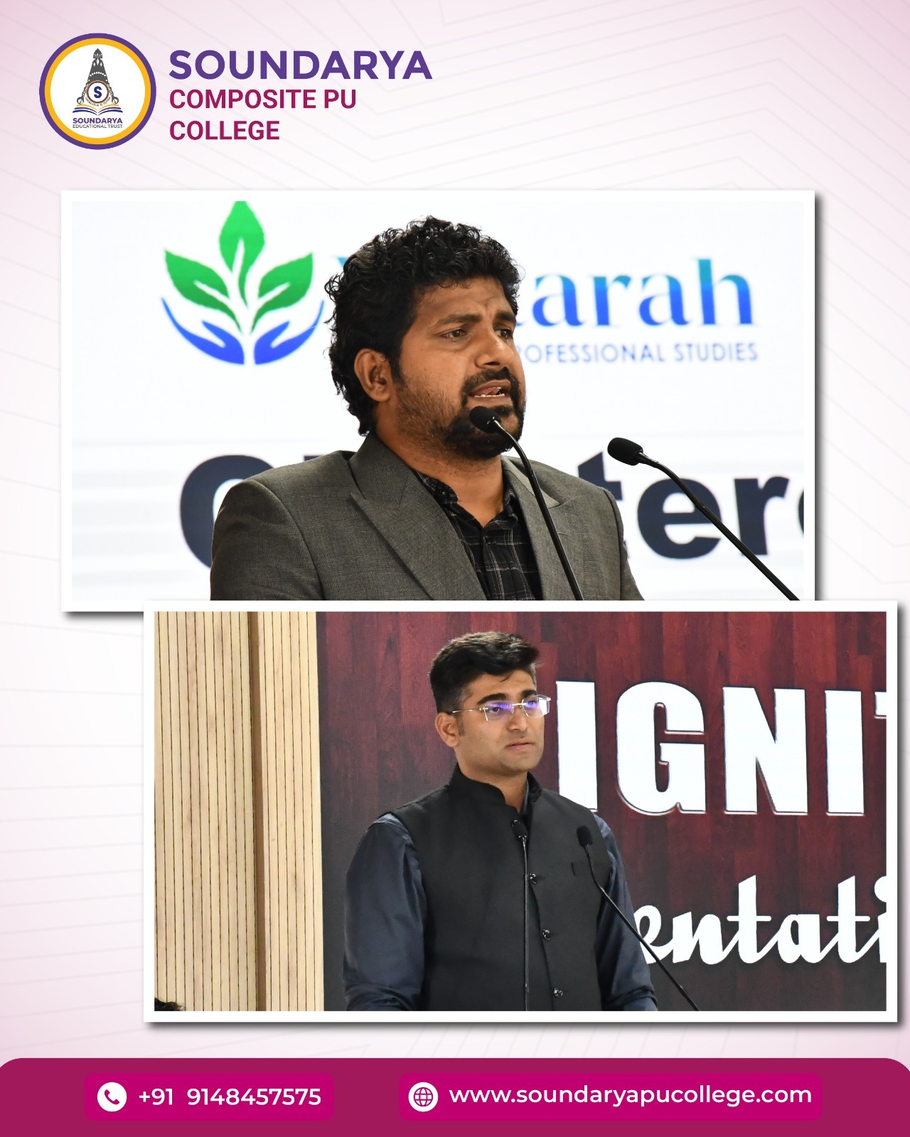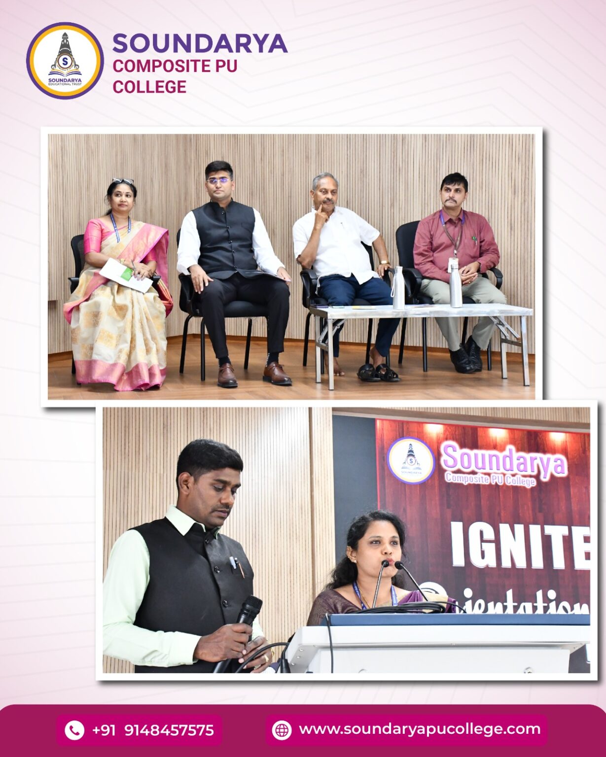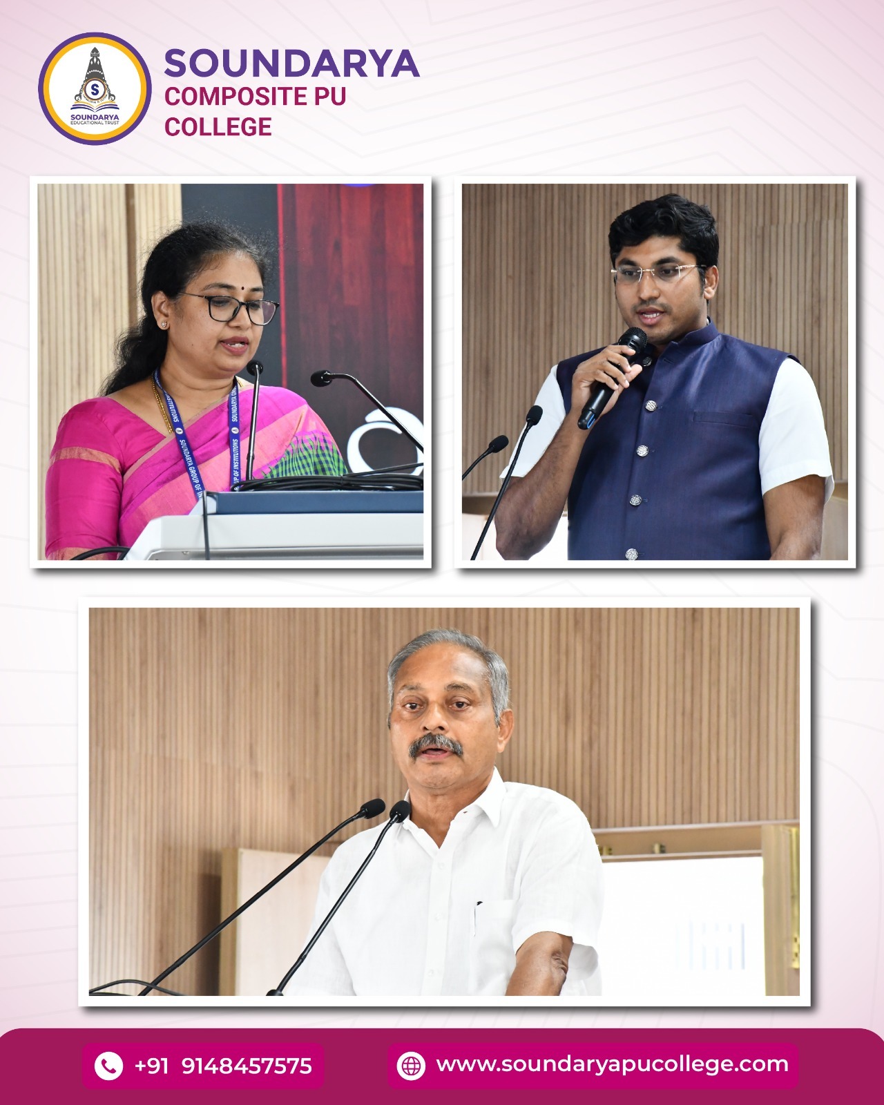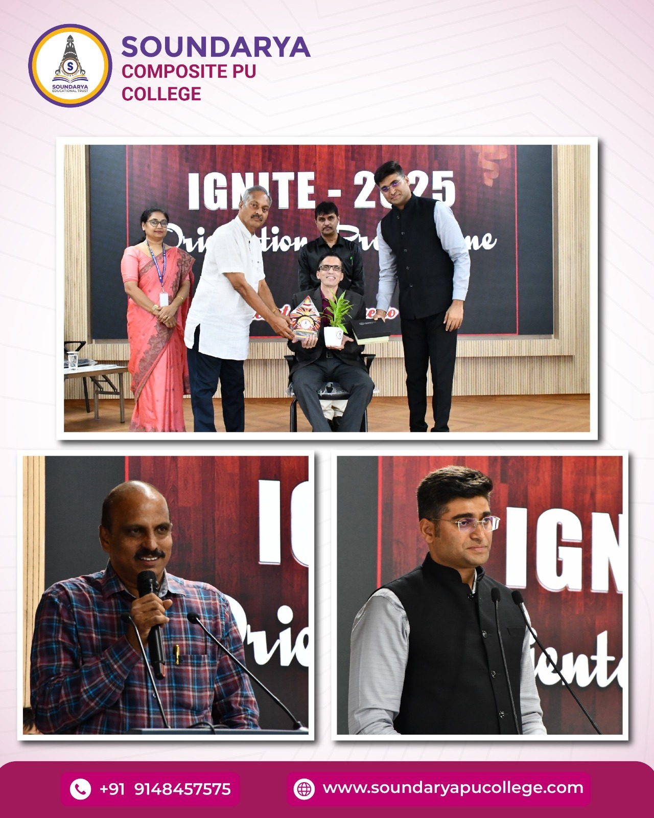 The IGNITE 2K25 Orientation Program at Soundarya Composite PU College began on an inspiring note as the institution welcomed parents and students of the incoming First PU batch. A highlight of the event was the felicitation of the Chief guest Mr. Ravindra Varna, Vice President – Engineering Delivery Head at India Development Center, Relevance Lab, for his remarkable contributions to the field of technology and education. He was honoured by Mr. Soundarya P. Manjappa, Founder of Soundarya Educational Trust, and Mr. Keerthan Kumar, CEO, Soundarya Group of institutions.