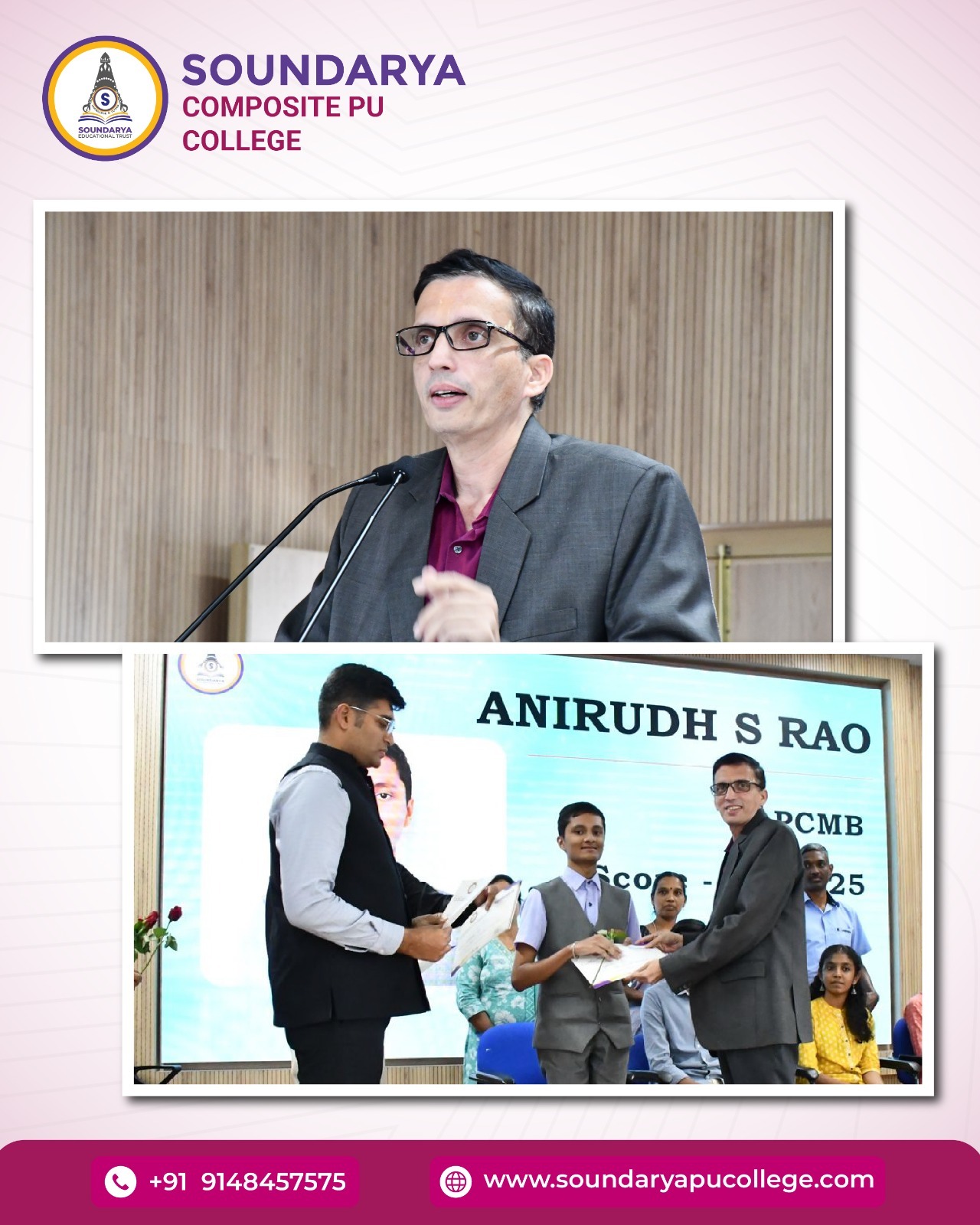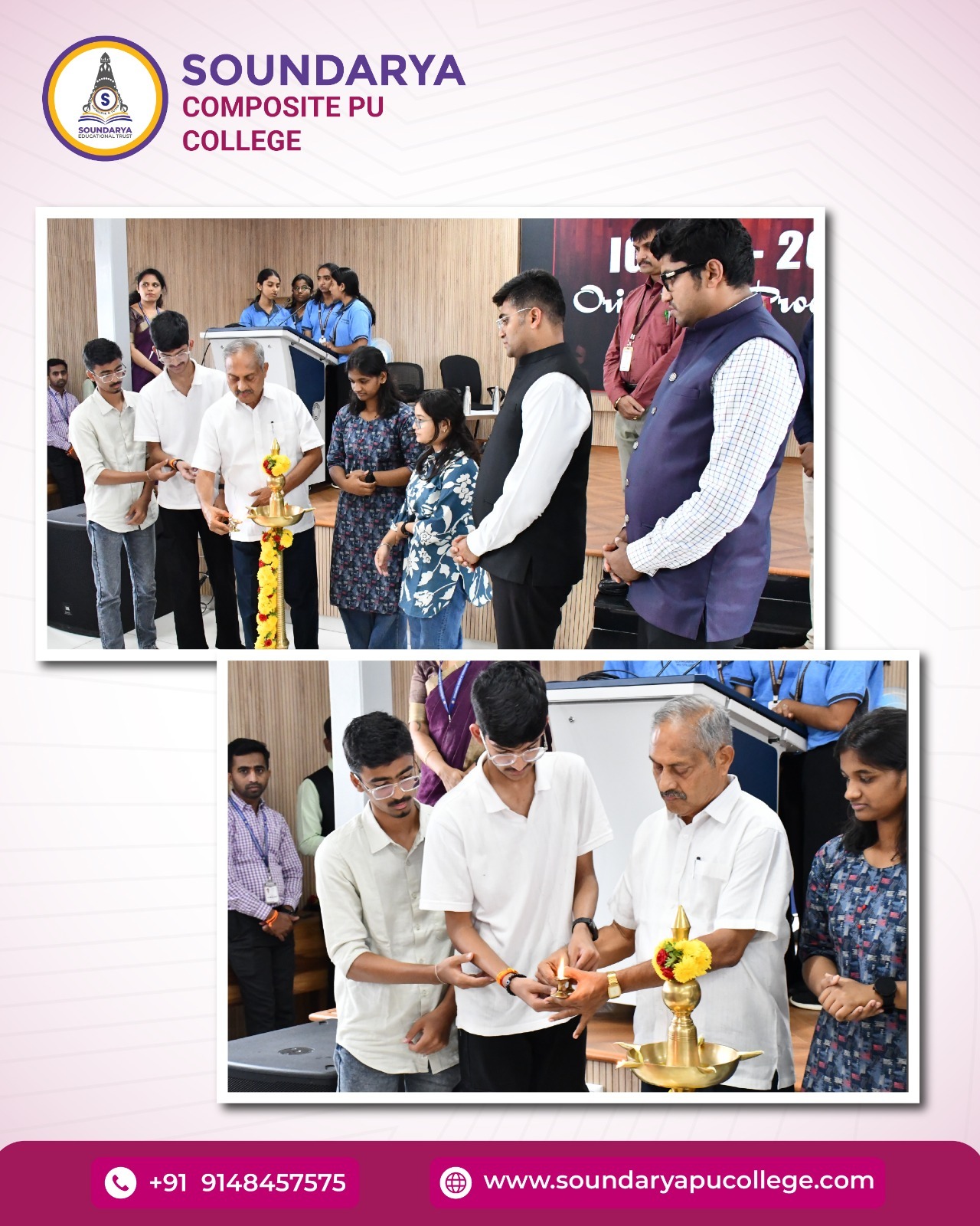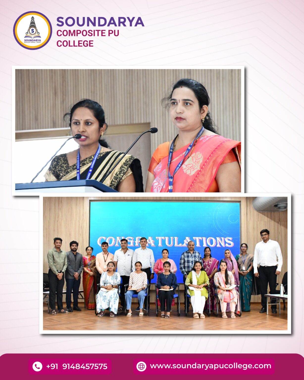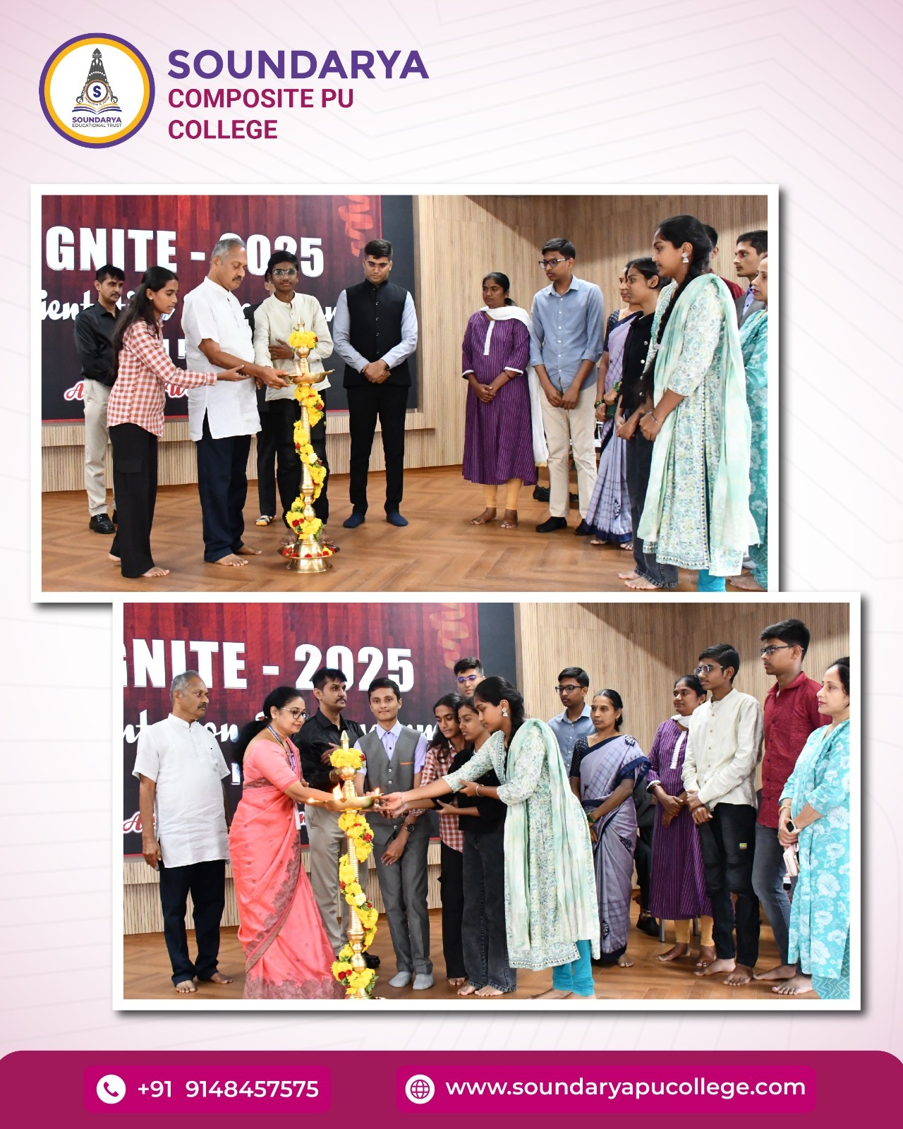 The IGNITE 2K25 Orientation Program at Soundarya Composite PU College began on an inspiring note as the institution welcomed parents and students of the incoming First PU batch. A highlight of the event was the felicitation of the Chief guest Mr. Ravindra Varna, Vice President – Engineering Delivery Head at India Development Center, Relevance Lab, for his remarkable contributions to the field of technology and education. He was honoured by Mr. Soundarya P. Manjappa, Founder of Soundarya Educational Trust, and Mr. Keerthan Kumar, CEO, Soundarya Group of institutions.