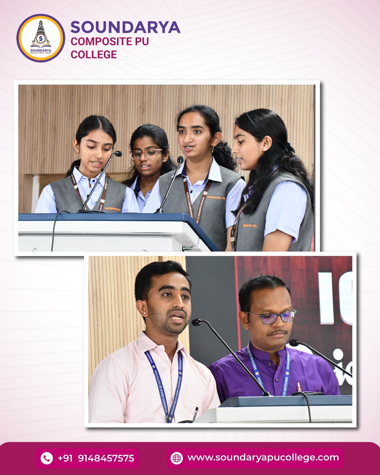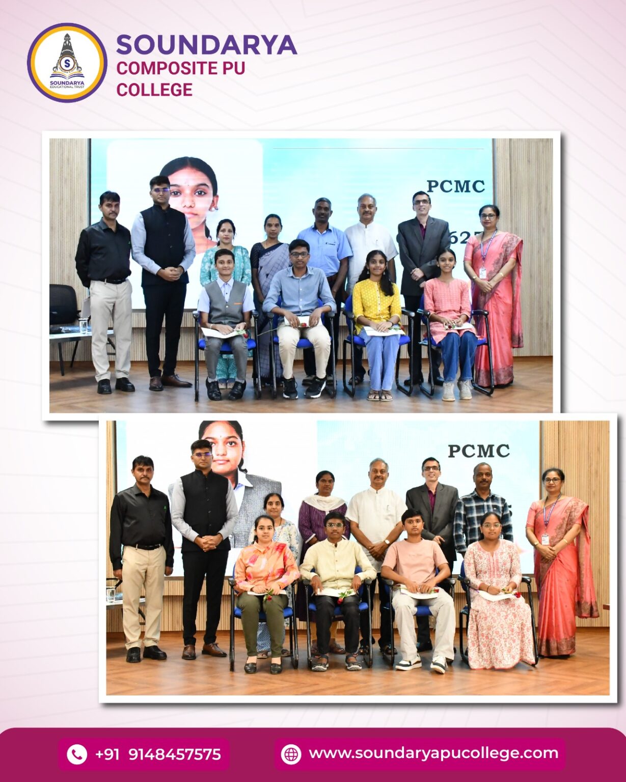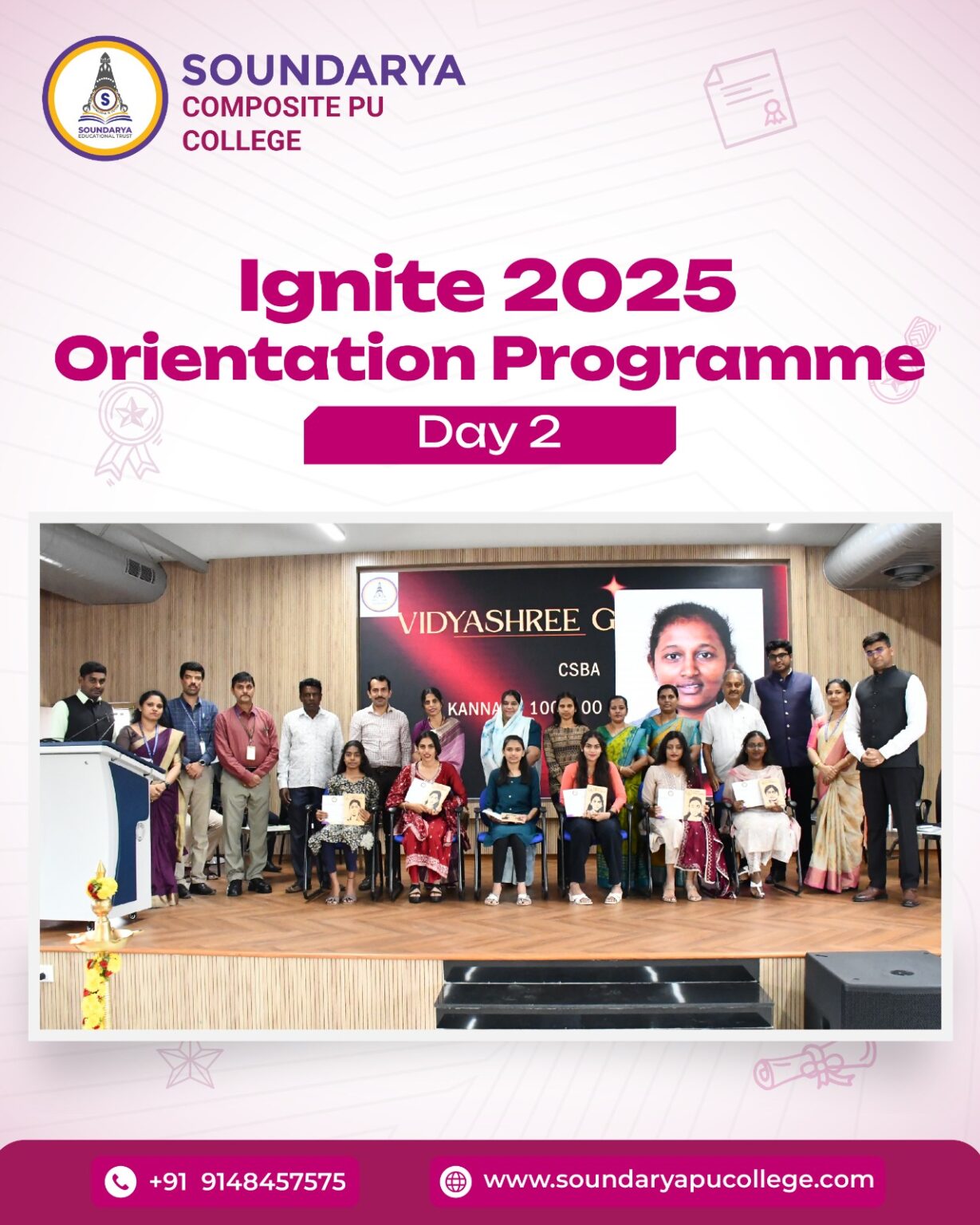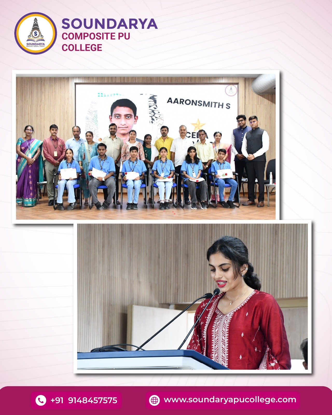 The IGNITE 2K25 Orientation Program at Soundarya Composite PU College began on an inspiring note as the institution welcomed parents and students of the incoming First PU batch. A highlight of the event was the felicitation of the Chief guest Mr. Ravindra Varna, Vice President – Engineering Delivery Head at India Development Center, Relevance Lab, for his remarkable contributions to the field of technology and education. He was honoured by Mr. Soundarya P. Manjappa, Founder of Soundarya Educational Trust, and Mr. Keerthan Kumar, CEO, Soundarya Group of institutions.